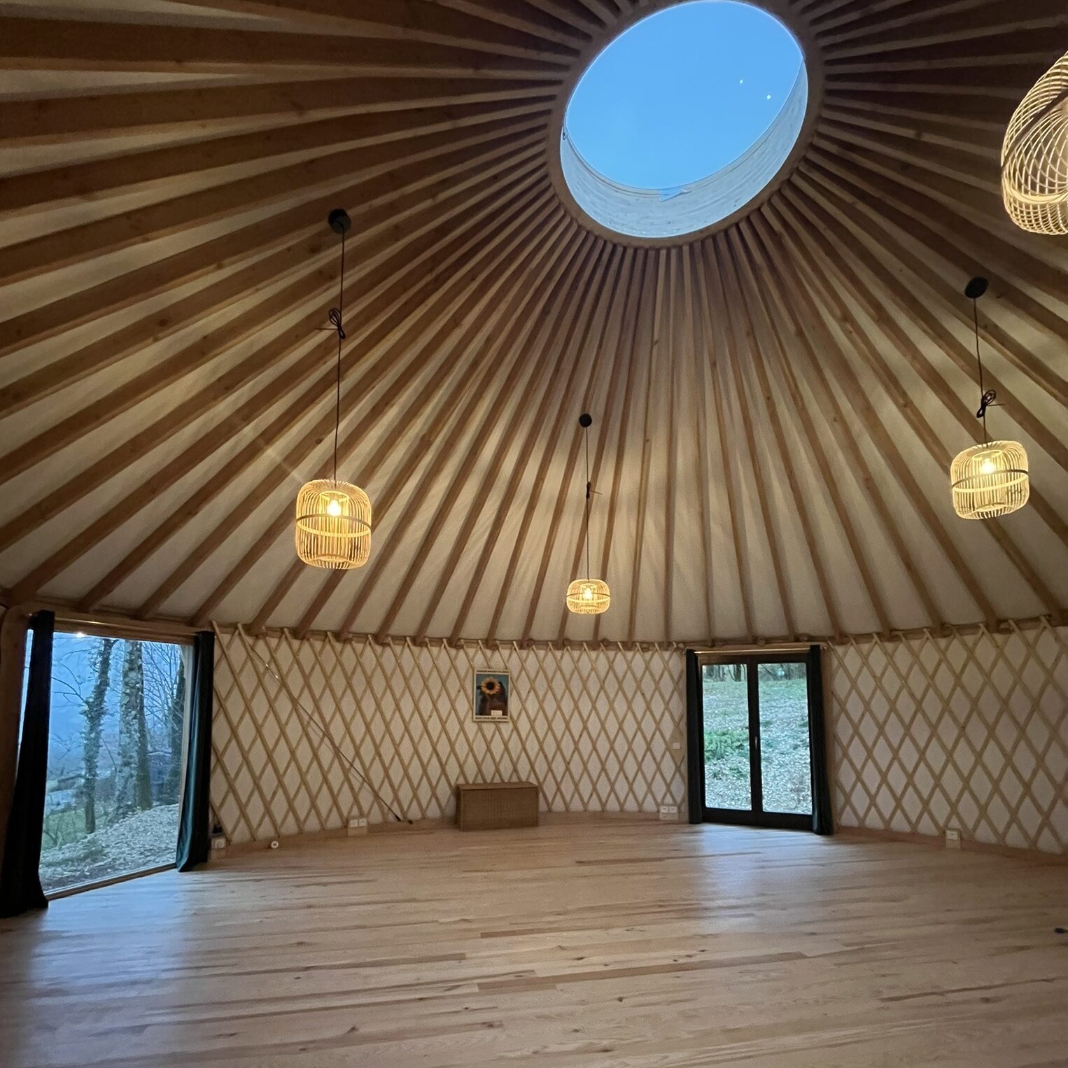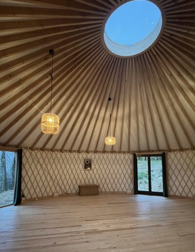 La Grande Yourte peut accueillir jusqu’à 30 personnes en configuration assise. Pour les séminaires avec hébergement, la capacité est de 18 couchages.